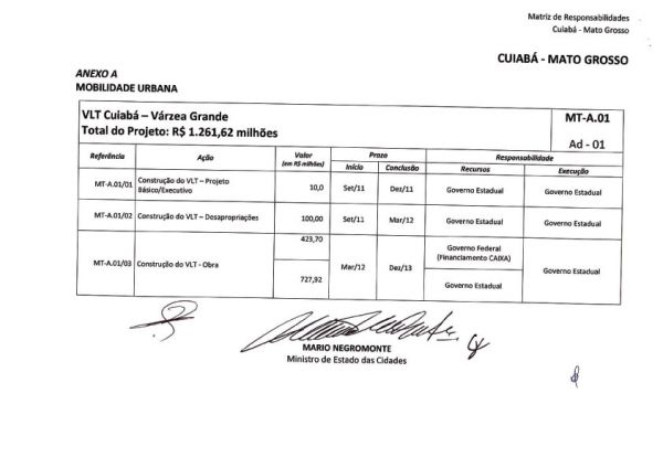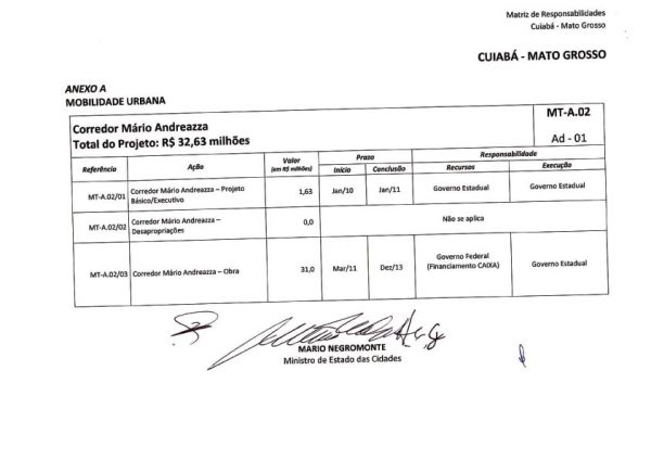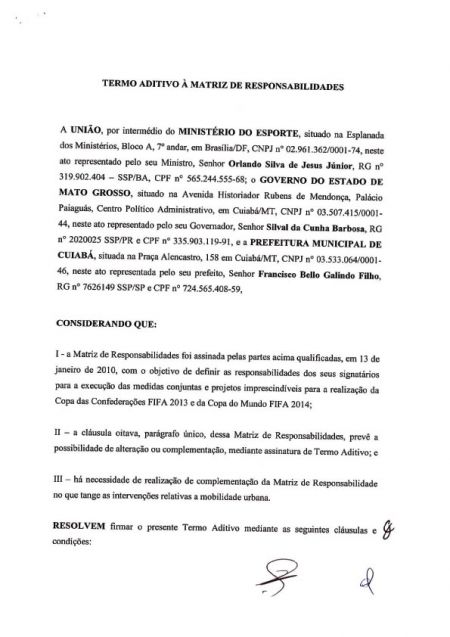 O documento traz ainda as assinaturas do então ministro de Estado do Esporte, Orlando Silva de Jesus Júnior e de Silval Barbosa (PMDB) que à época era o governador de Mato Grosso. Conforme a cláusula primeira do termo aditivo, o objetivo era complementar a Matriz de Responsabilidade no que dizia respeito às intervenções relativas a mobilidade urbana, de acordo com os projetos definidos.